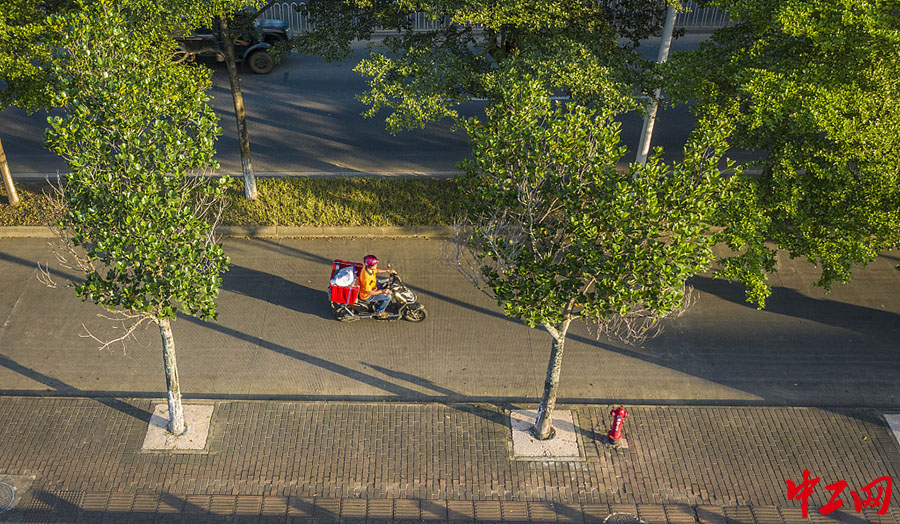 11月6日,海口,秋日的斜阳照在老陆的快递路上。