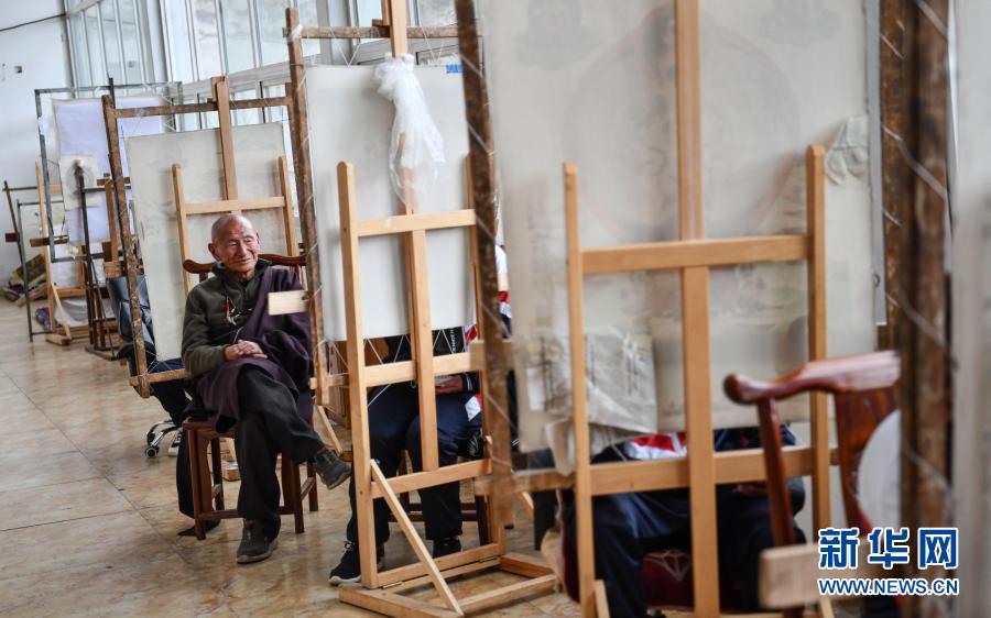 嘎玛德勒老人在西藏昌都市卡若区嘎玛乡的民族手工艺培训基地里教学员们画唐卡(10月3日摄)。新华社记者 晋美多吉 摄