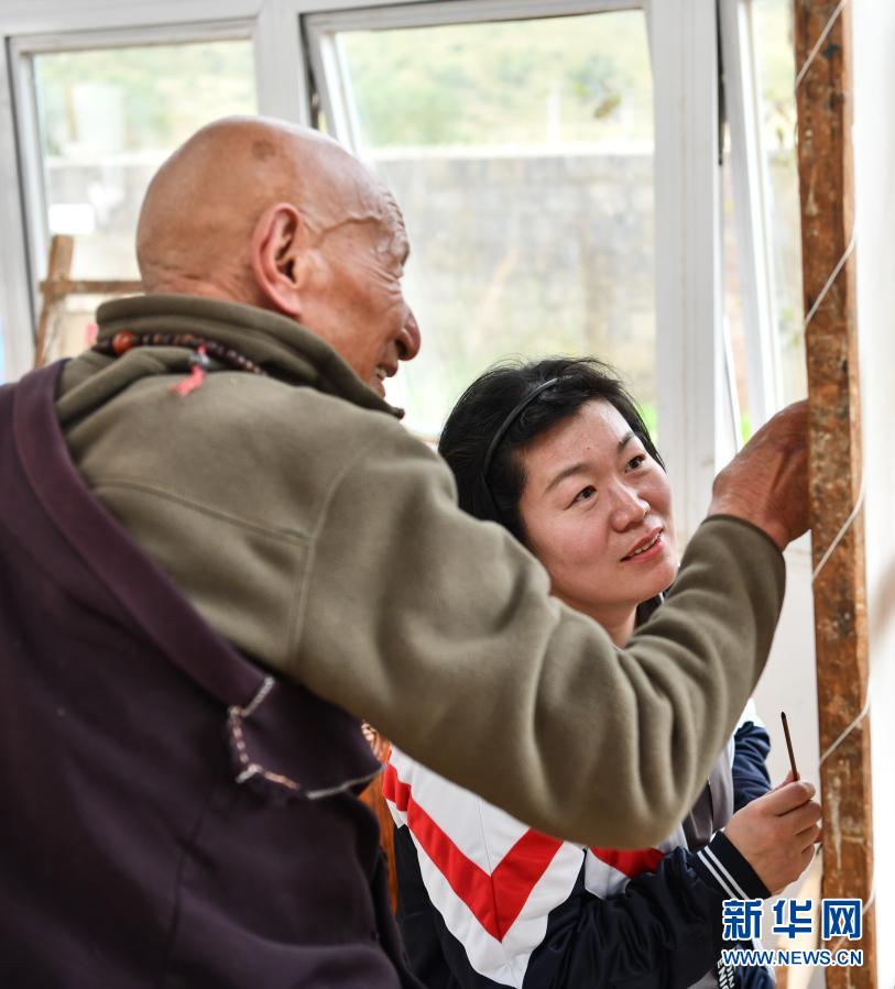 在西藏昌都市卡若区嘎玛乡的民族手工艺培训基地,嘎玛德勒老人在教一名来自内地的女学员画唐卡(10月3日摄)。新华社记者 晋美多吉 摄