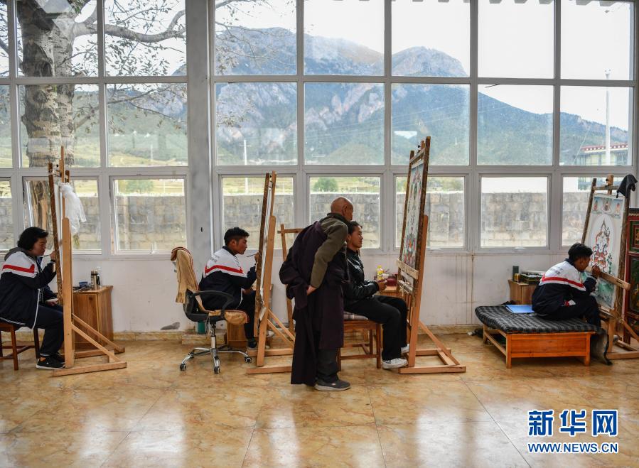 嘎玛德勒老人在西藏昌都市卡若区嘎玛乡的民族手工艺培训基地里教学员们画唐卡(10月3日摄)。新华社记者 晋美多吉 摄