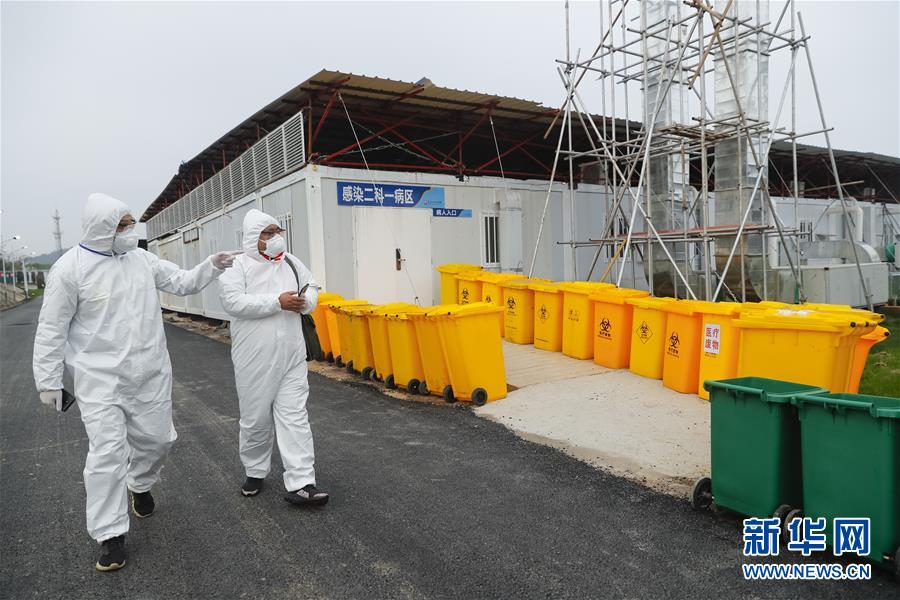 尹典(左)和同事张健在武汉火神山医院巡视检查(3月31日摄)。新华社记者 沈伯韩 摄