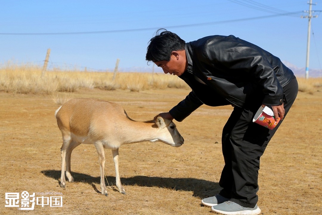 正在院里忙碌的尖木措看到了它,赶忙迎接。它,名叫“小瘦瘦”,今年一岁半,是尖木措去年救助的一只普氏原羚。被救助时的它才刚刚出生,身体十分瘦弱,所以尖木措给它取名“小瘦瘦”。尖木措轻轻抚摸“小瘦瘦”的头。新华网 卡娅梅朵摄