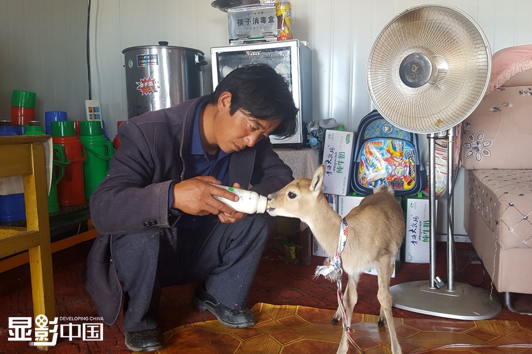 今年44岁的尖木措是青海省海北藏族自治州海晏县甘孜河乡达玉村的牧民,自1996年起,尖木措便开始和好友自发救助普氏原羚等野生动物,并捡拾青海湖畔的垃圾。从达玉村周边的草原到青海湖边,这条路尖木措来来回回走了二十多年,经他救助并康复的普氏原羚已有十余只。尖木措正在给年幼的普氏原羚喂奶。(图片由受访者提供,拍摄于2016年7月)