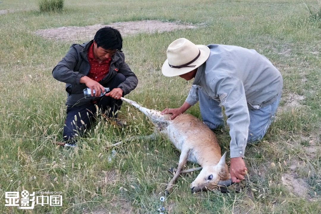 普氏原羚是国家一级保护动物,曾广泛分布于内蒙古、宁夏、甘肃、青海等省区,由于人类活动影响及栖息地恶化,目前青海湖环湖地区是普氏原羚的唯一栖息地。尖木措与同伴正在给一只受伤的普氏原羚处理伤口。(图片由受访者提供,拍摄于2017年8月)