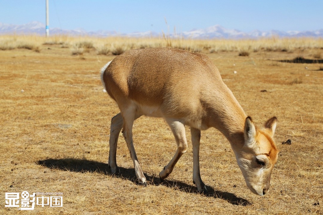 尖木措与同伴苏科、才仁加等8人组成了其中一支牧民巡护队。日常工作主要是在青海湖畔进行巡护、捡拾垃圾、保护普氏原羚等野生动物。“小瘦瘦”正在草原上觅食。新华网 卡娅梅朵摄