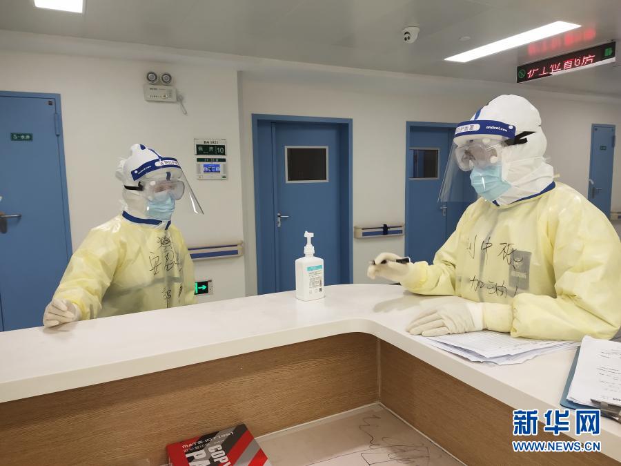 北京大学人民医院创伤救治中心主治医师刘中砥(右)在污染区内工作(2月9日摄)。新华社发