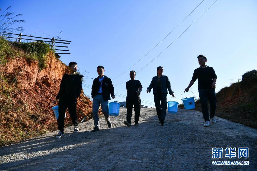 在从江县停洞镇东勤村,刘瑛(右二)、贺常乐(左一)与驻村工作队的队员们前往集体种植的吊瓜基地采收吊瓜途中(11月11日摄)。新华社记者 杨文斌 摄