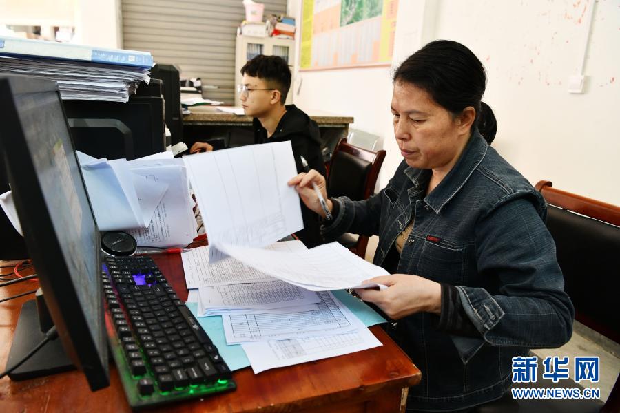 刘瑛(右)与贺常乐在从江县停洞镇东勤村脱贫攻坚指挥所核对扶贫材料信息(11月11日摄)。新华社记者 杨文斌 摄