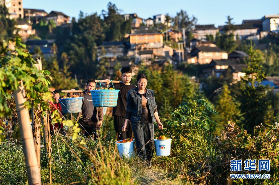 在从江县停洞镇东勤村,刘瑛(前一)、贺常乐(前二)与村干部们在搬运村集体种植的吊瓜(11月11日摄)。新华社记者 杨文斌 摄