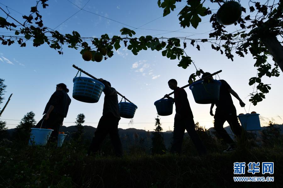在从江县停洞镇东勤村,刘瑛(左一)、贺常乐(右一)与村干部们在搬运村集体种植的吊瓜(11月11日摄)。新华社记者 杨文斌 摄