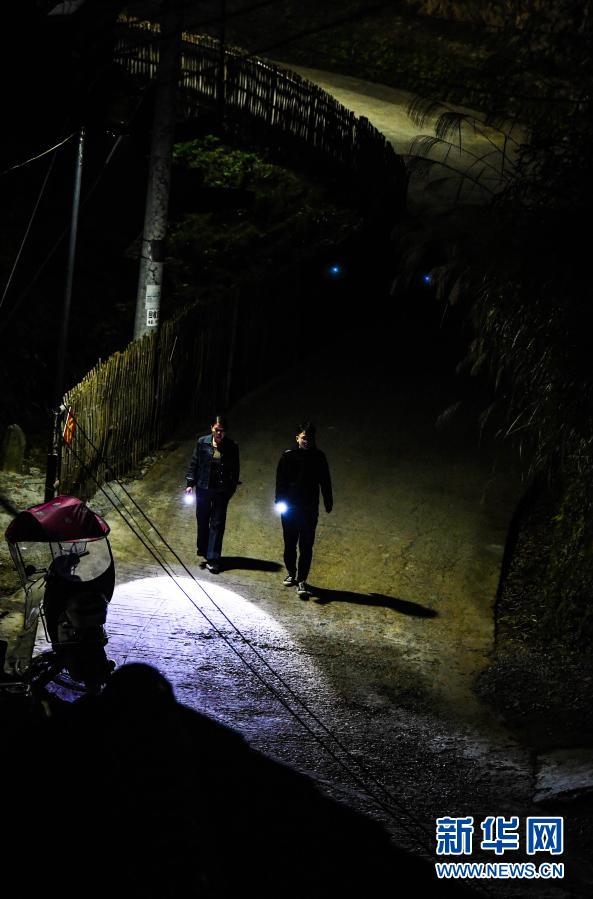 在从江县停洞镇东勤村,刘瑛(左)与贺常乐在连夜走访建档立卡贫困户途中(11月11日摄)。新华社记者 杨文斌 摄