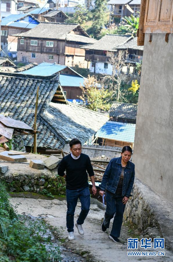 在从江县停洞镇东勤村,刘瑛(右)与东勤村脱贫攻坚指挥所所长韦璐在走访建档立卡贫困户途中(11月11日摄)。新华社记者 杨文斌 摄