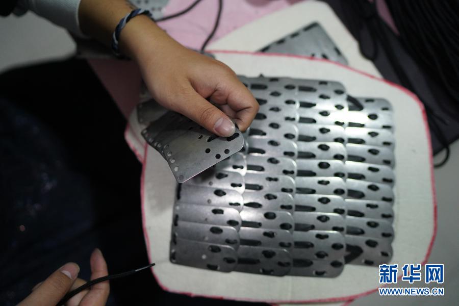 11月13日,在位于赣州市章贡区的工作室,“虔州武备司”成员在串编甲片。新华社记者 周密 摄