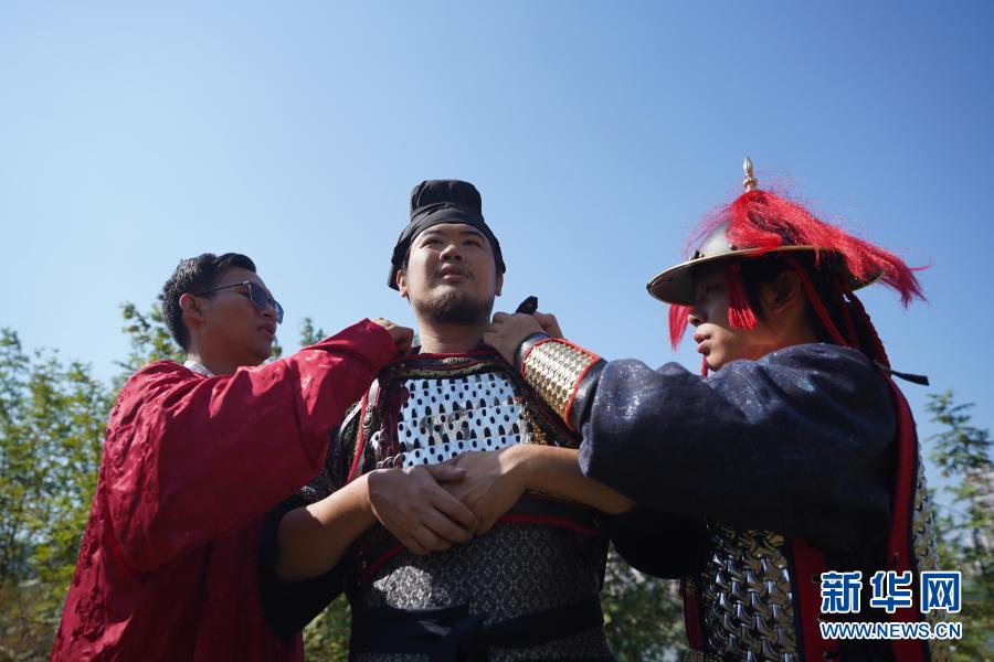 11月13日,在赣州市章贡区,“虔州武备司”成员曾繁强(左)、黄正源(右)帮宋昊穿上唐代铠甲。新华社记者 周密 摄