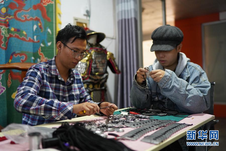 11月13日,在位于赣州市章贡区的工作室,“虔州武备司”成员曾繁强(左)、小邱在串编甲片。新华社记者 周密 摄