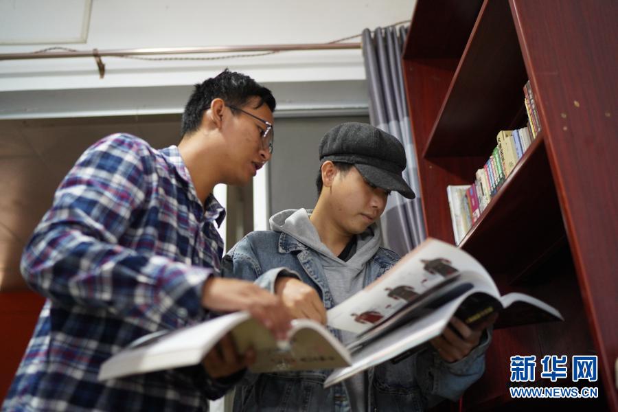 11月13日,在位于赣州市章贡区的工作室,“虔州武备司”成员曾繁强(左)、小邱在查阅书籍。新华社记者 周密 摄