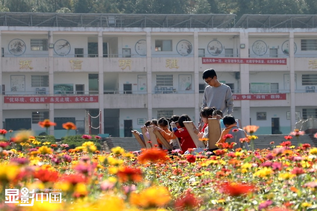 初冬时节,走进江西省宜春市袁州区寨下镇中心小学,一片偌大的花海映入眼帘,五彩缤纷的花朵随着微风轻轻摇曳。很难想象,几个月前这里还是杂草丛生的荒芜地。图为寨下镇中心小学的学生们正在花海中画画写生。新华网 王凯丰摄