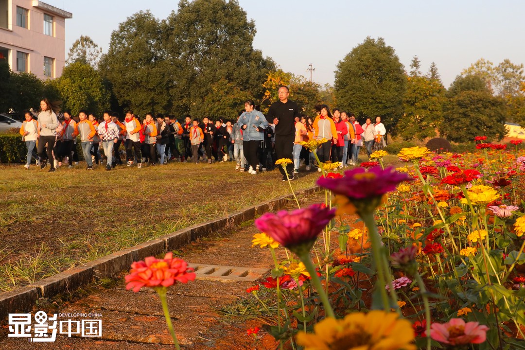 图为寨下镇中心小学的师生们正在花海旁进行跑步晨练。新华网 王凯丰摄