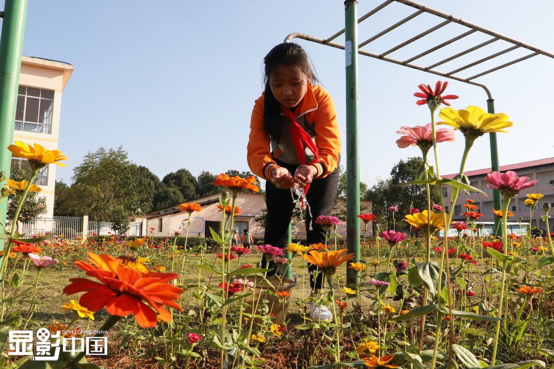 “种花和育人其实是相通的。”殷大福说,每一颗种子,只要努力生长、悉心培育浇灌,总能开出最美的花。图为寨下镇中心小学的学生正在给花浇水。新华网 王凯丰摄