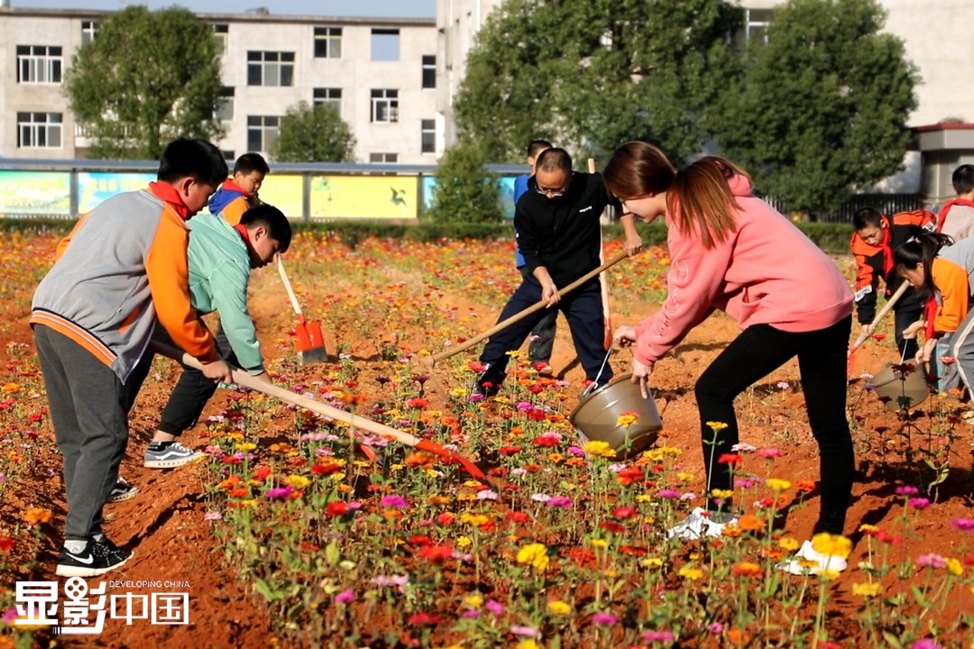 种在学校的这片花海也种进了孩子们的心里。图为寨下镇中心小学的师生们正在花海中劳动。新华网 王凯丰摄
