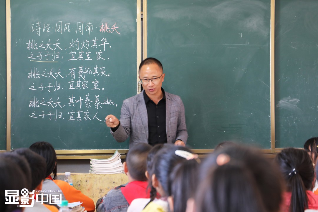 殷大福认为,只有在美的环境中才能培养美的人。图为寨下镇中心小学校长殷大福正在给学生们上课。新华网 王凯丰摄