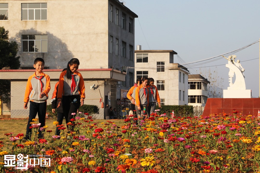 “我和我的同学们都不会去采这些花,反而会呵护这些花,我们想让这片美好一直保留下去。”寨下镇中心小学六年级五班学生李馨菲说。图为学生们正在花海旁赏花。新华网 王凯丰摄