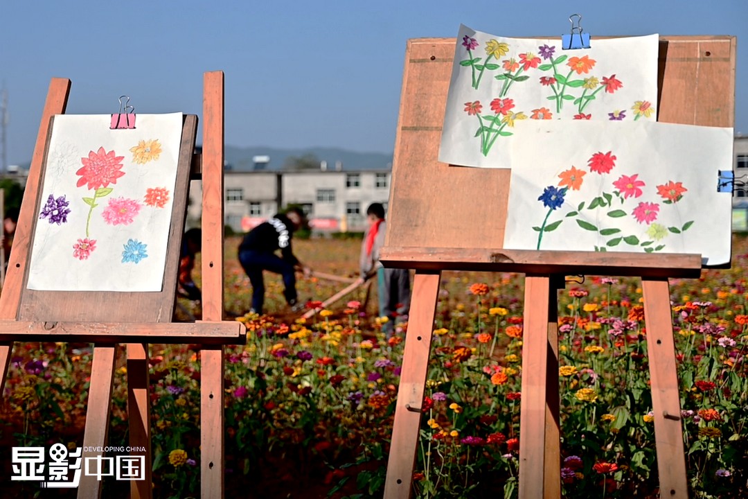 画画写生、十字绣、踢球跑步……花开后,学校也会利用这片花海适时地对孩子们进行美育教育,从小培养孩子对美的理解和追求。图为在花海旁摆放的画板。新华网 王凯丰摄
