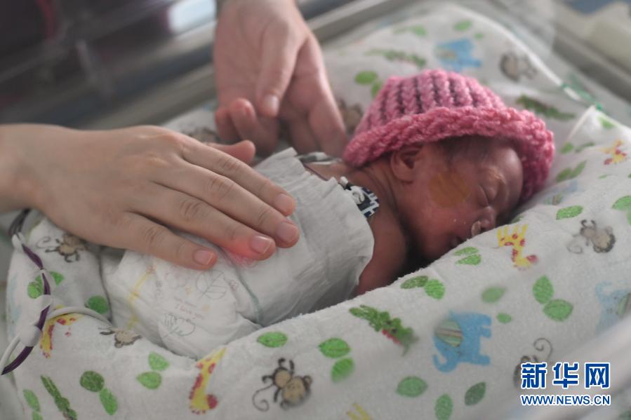 11月16日,护士在浙江大学医学院附属儿童医院新生儿重症监护室对早产宝宝进行抚触,宝宝头戴着医护人员特别编织的帽子。
