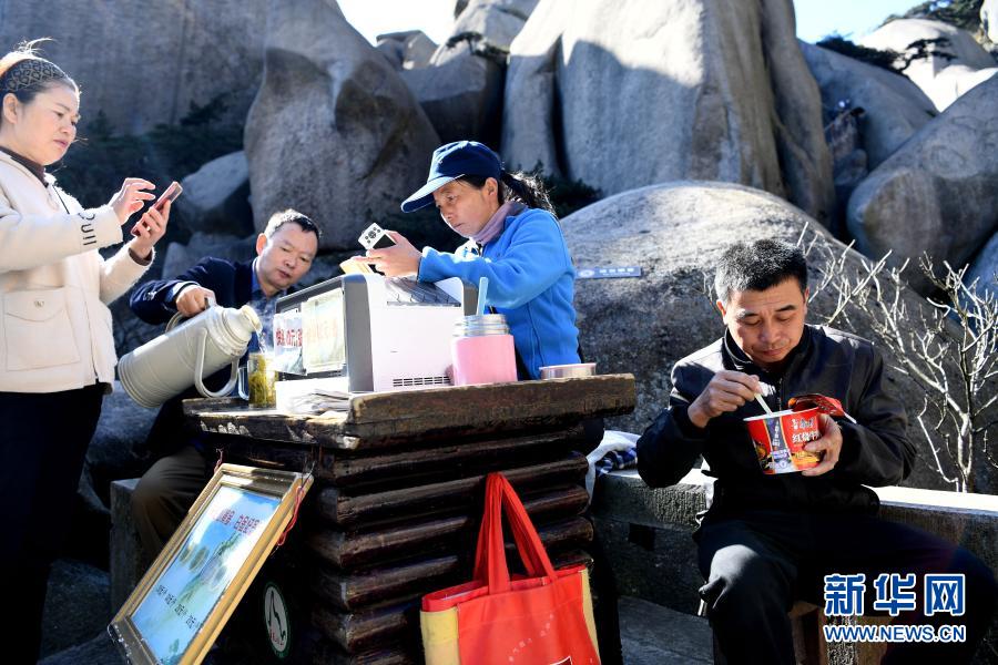 11月13日,徐胜利(右一)送货到达天池峰后,返回杨月红工作的平台,与她一起吃午餐。新华社记者张端摄