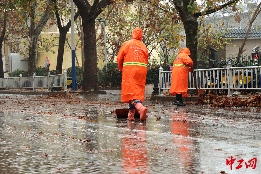 11月18日,山东泰安连续降雨降温,不少冬叶纷纷落下,沾了雨水的落叶很难用机械化车辆清理,环卫工全体上阵,采用人力作业清理落叶,保障市民行路安全。(来源:视觉中国)