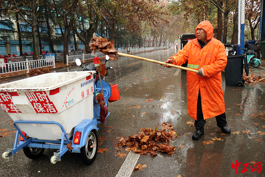 11月18日,山东泰安连续降雨降温,不少冬叶纷纷落下,沾了雨水的落叶很难用机械化车辆清理,环卫工全体上阵,采用人力作业清理落叶,保障市民行路安全。(来源:视觉中国)