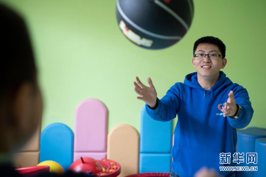 11月18日,在太原市灵星社区服务中心,李林峰和自闭症患儿做游戏。