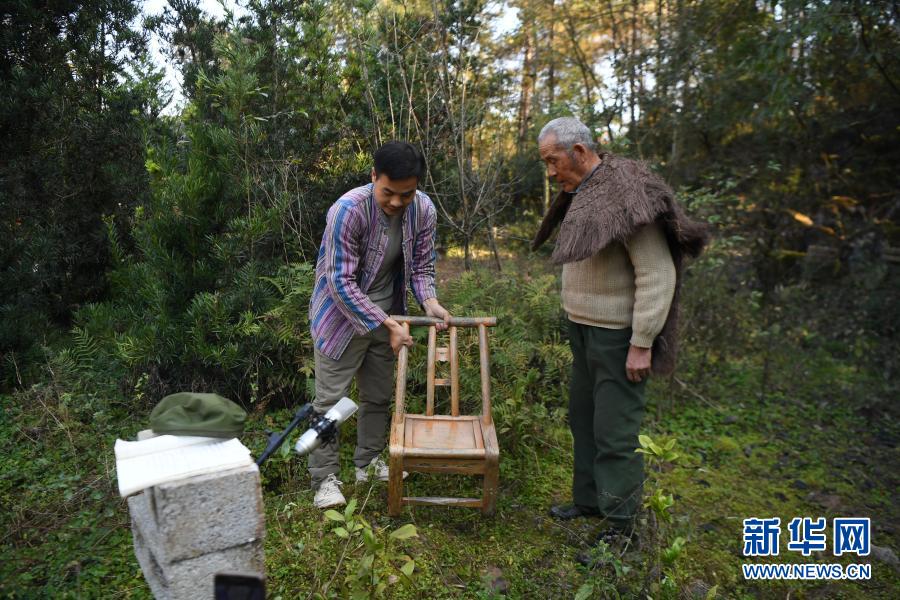 11月15日,彭国飞(右)和团队伙伴彭超文在湘西芙蓉镇选取场景,准备录制短视频。新华社记者 薛宇舸 摄