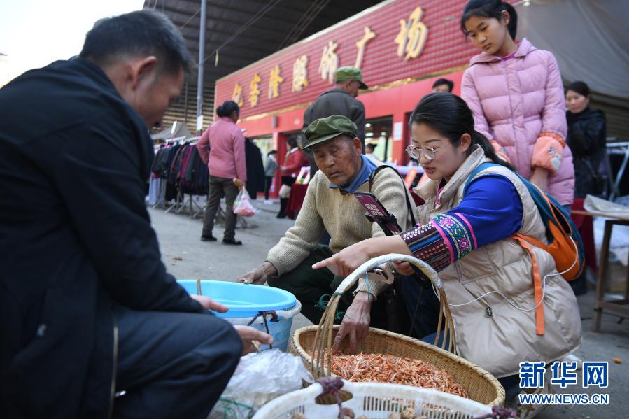 11月15日,彭国飞(中)和团队伙伴张芳(右一)在湘西芙蓉镇集市为商贩直播卖鱼虾。新华社记者 薛宇舸 摄