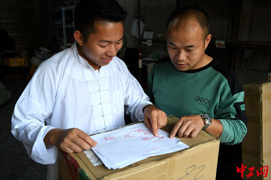 11月18日,潘方健在贵州省榕江县城的公司里给送货员交待送货路线。(来源:视觉中国)