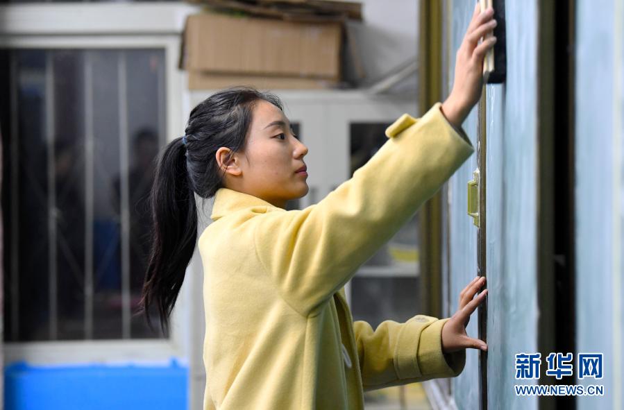 11月17日,王予川在德亭镇酒店小学教室内擦黑板。