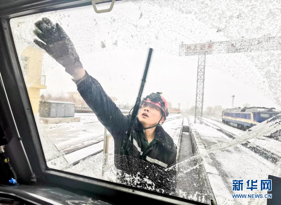 18日,中国铁路呼和浩特局集团有限公司大板综合维修段职工在清理机车上的积雪(手机拍摄)。