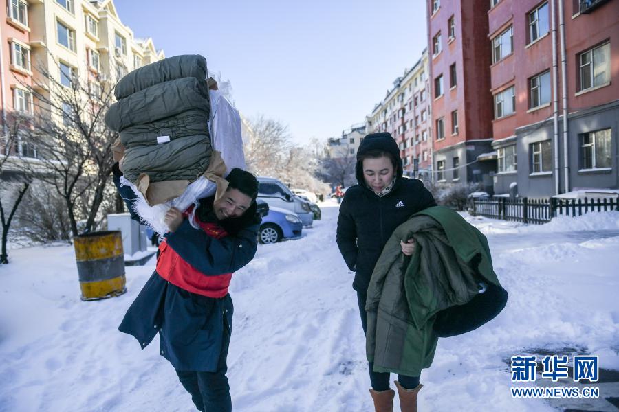 11月20日,长春市宽城区欣园街道桐雨社区工作人员准备入户发放防寒物资。新华社记者颜麟蕴摄