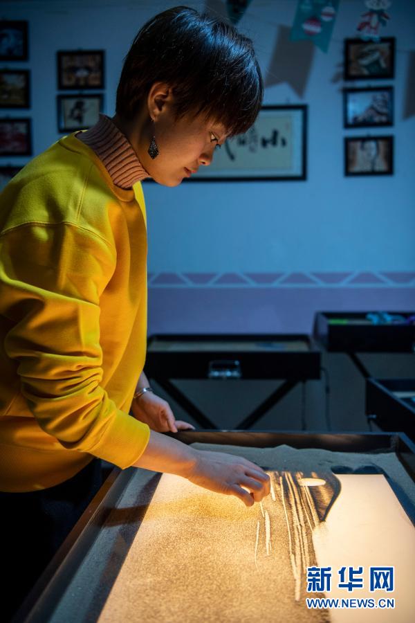 11月20日,朱霞在位于太原市晋源区的沙画工作室内制作沙画。新华社记者 杨晨光 摄