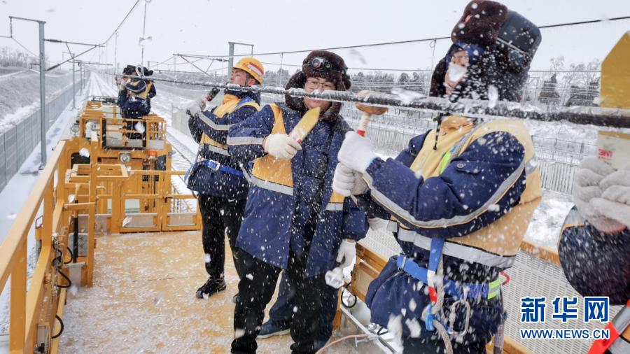 11月19日,铁路工人在长珲高铁沿线进行接触网除冰作业。