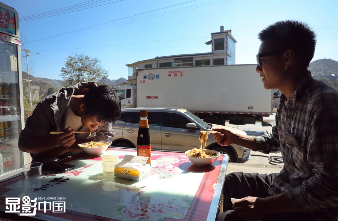 中午12点,“兄弟”俩找个加水站为货车加水,并一人点了一碗米粉当中午饭。粉、面、炒饭是货车司机在路上最常选择的几样食物。新华网 卢志佳摄