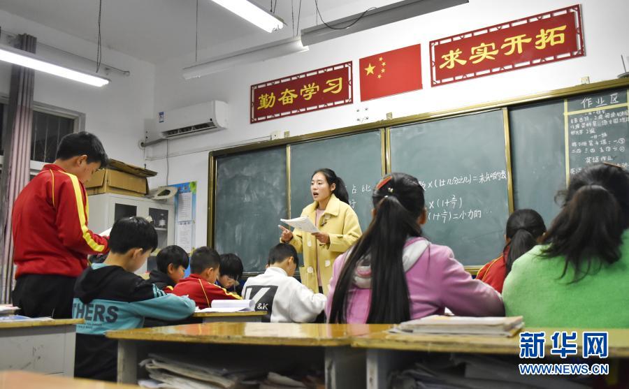11月17日晚,在河南省洛阳市嵩县德亭镇酒店小学,王予川给寄宿小学生辅导功课。新华社记者 韩朝阳 摄