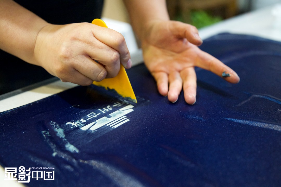 灰缬的最后一步是刮浆。由于灰浆的保护,设计好的图案得以在染好的布料上被保留下来,形成好看的图样及花式。新华网 武斌/文 付宇鹏/摄