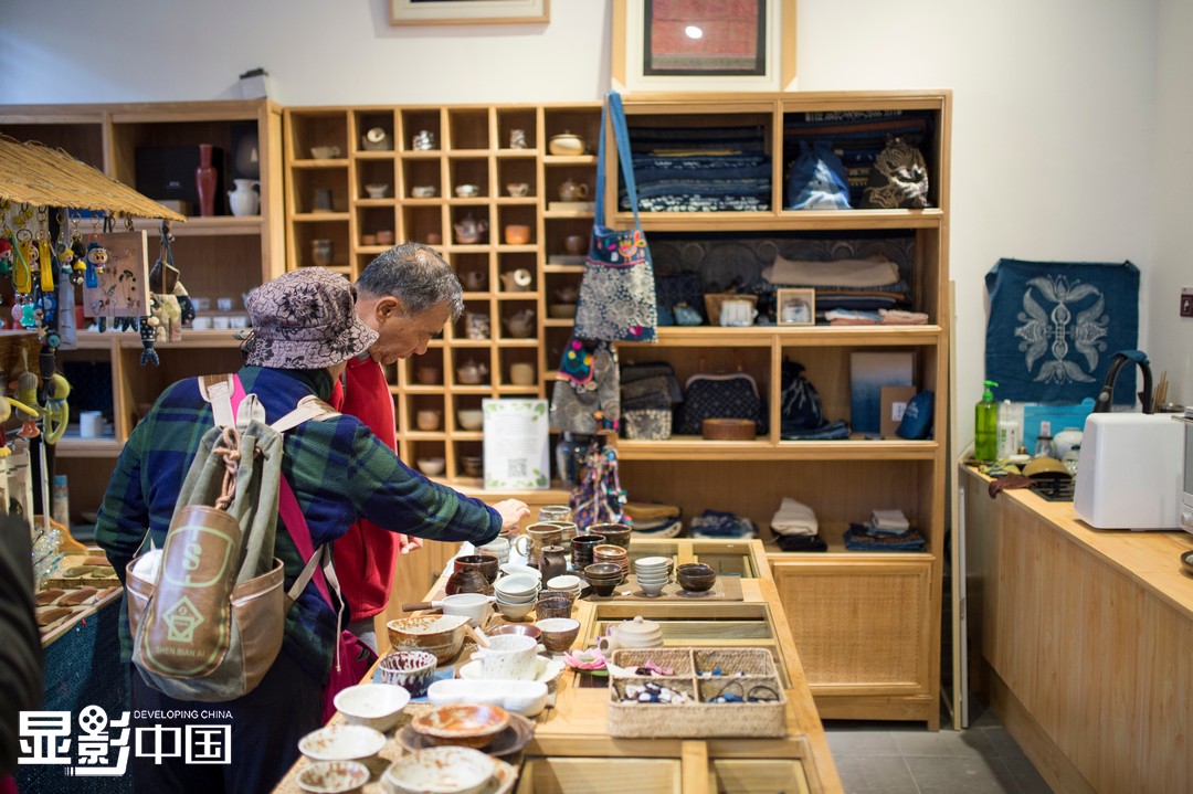 2020年2月,赵慧的工作室正式挂牌“忻州市非遗扶贫就业工坊”,她也将贫困群众的手工艺品带到了古城。图为古城游客在赵慧的工坊内挑选手工艺品。新华网 武斌/文 付宇鹏/摄