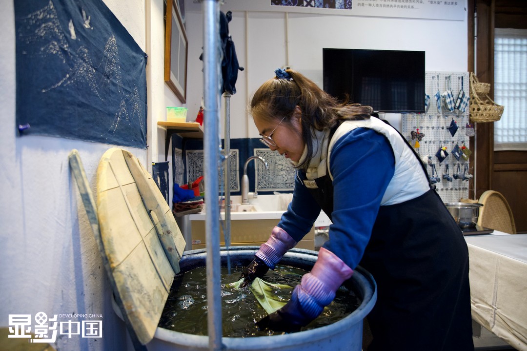 “染布是个体力活。”为了均匀上色,赵慧在染布时要不停地翻动布料,“上色一般需要十几分钟,要一直保持这个姿势,往往染不了几块就满头是汗。”赵慧说,时常有人找她学习天然染色,但能坚持下来的人少之又少。新华网 武斌/文 付宇鹏/摄