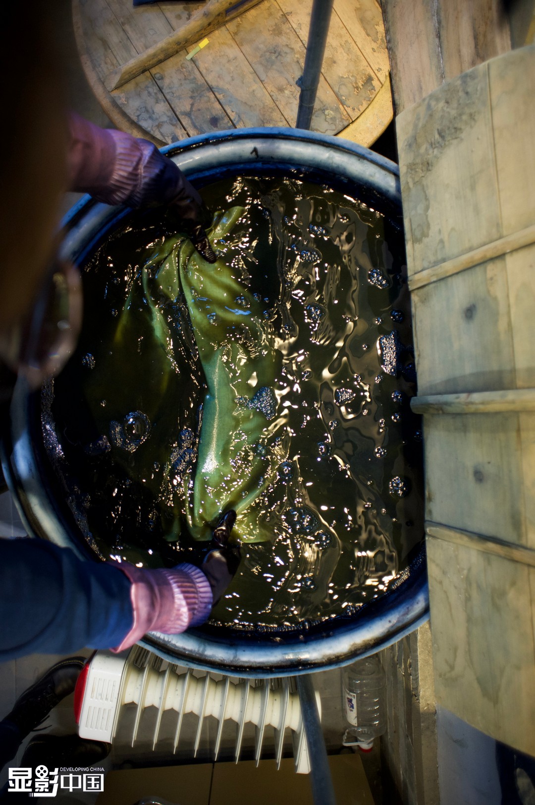 据赵慧介绍,天然染料包含矿物、动物及植物三种。她所传承的草木染便是指以草本植物为染色原料对织物进行染色的技艺。赵慧染缸里使用的天然染料以靛蓝为主,来源于蓝草,是中药板蓝根的叶子。新华网 武斌/文 付宇鹏/摄