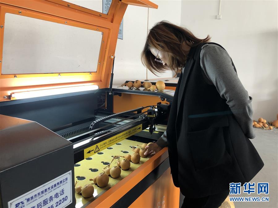 在天津市西青区辛口镇大杜庄村的葫芦加工体验馆,朱娜对葫芦进行工艺加工(10月19日手机拍摄)。新华社记者 宋瑞 摄