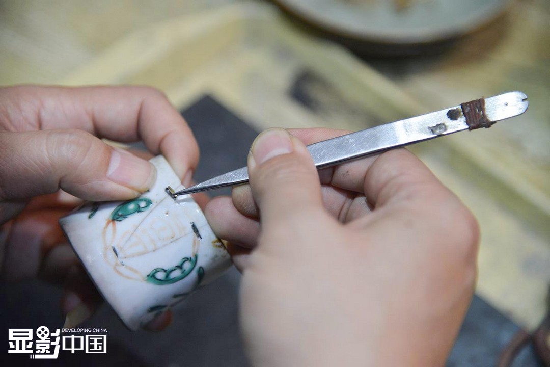 后来,他更多地在一些细节美观度上下功夫。“这些锔钉是经过我艺术加工的。”李军航拿起自己“设计”的作品介绍说。