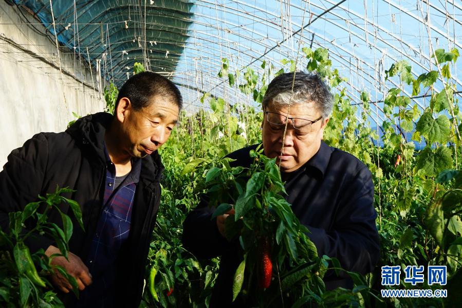 11月27日,关慧明(右)在乌兰察布市马莲渠乡霸王河村村民常建新的温室里向他传授病虫害防治技术。新华社发(侯维轶 摄)