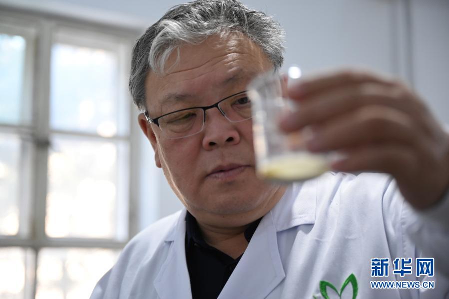 11月27日,关慧明在实验室查看提取的芦笋汁液。新华社发(侯维轶 摄)